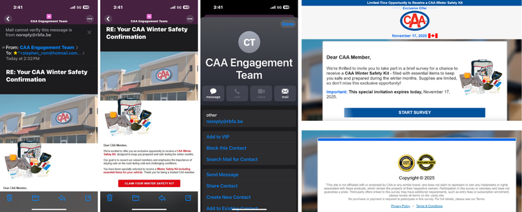 CAA Saskatchewan has received calls and emails about fraudulent messages claiming to be from us. These scams often involve fake surveys, prize offers, or urgent membership updates. These messages are not from CAA.